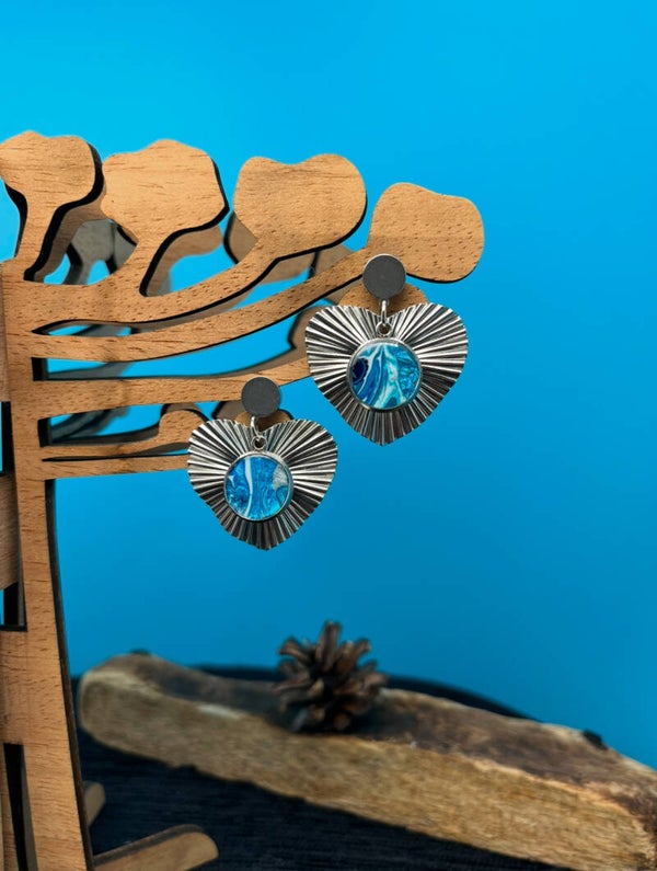 Toutes les boucles d'oreilles sont en acier inoxydables décorées avec de la peinture acrylique fluide et recouvertes d'une cabochon en verre ou de la résine. Chaque modèle est unique